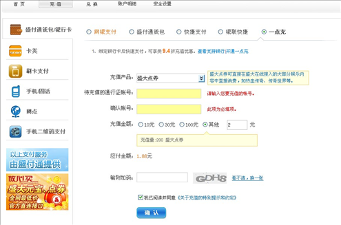 1.登录盛付通充值,选择“一点充”,填写相关信息。