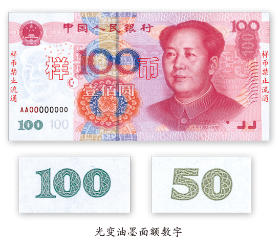 观察方式:第五套人民币100元和50元正面左下角的面额数字“100”和“50”是使用光变油墨印制的。垂直观察票面,“100”呈现绿色,“50”呈现金色;当倾斜票面观察时,“100”变为蓝色,“50”变为绿色。